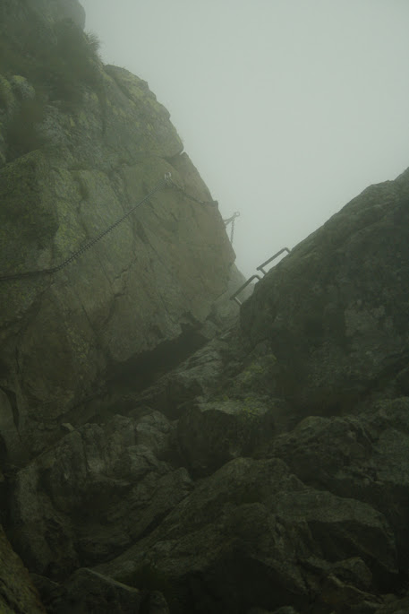 W takich miejscach pomimo braku widoków można się nie-nudzić ;) Ręcę praktycznie cały czas pracują, łańcuchów jest sporo, a biała przestrzeń po prawej stronie wskazuje na to, że może być tam niezła lufa. Szlak jest ciekawy :) A najciekawszy? Odcinek z klamrami. Czy to tu zdarzają się te wypadki? Nie dowiemy się. Widoczność nadal ogranicza się do paru metrów przed sobą ;) Mimo wszystko, lubię taki klimacik wśród granitu.