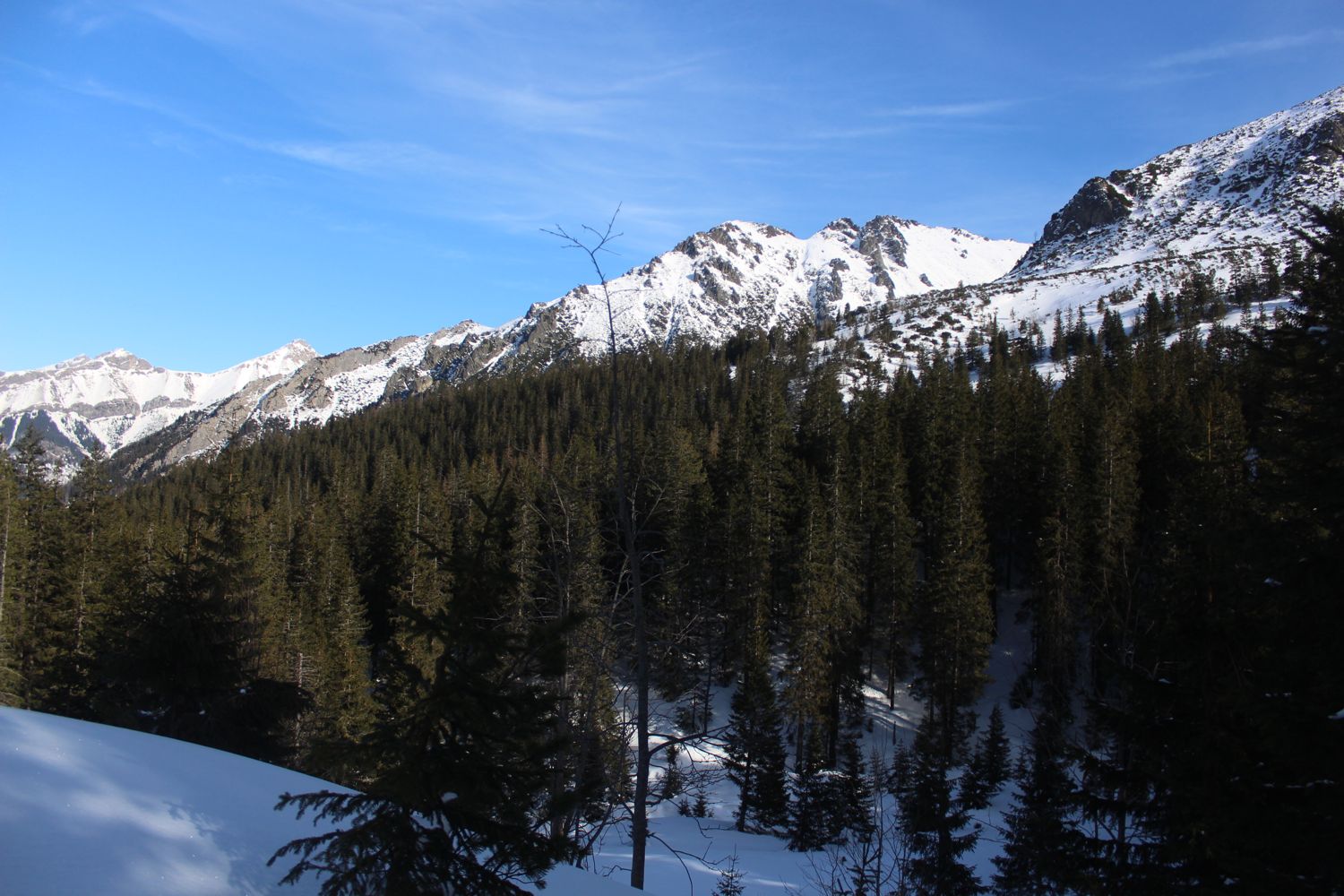Tuż za polanką ukazuje się cząstka otoczenia głębszej części Doliny Jaworowej. Do tej pory byłem tutaj tylko raz, a i to bez większych widoków. Ktoś się nieco wkopał samochodem. Strażnik? Jak będziemy wracać, już tego samochodu tutaj nie będzie. Mimo zakazów wędrowania po szlakach po słowackiej stronie, również turyści i narciarze korzystają z pogody.